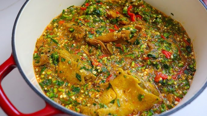 Okra soup is more common with the Igbo tribe of Nigeria and is prepared using the edible green seed pods of the okra flowering plant as a primary ingredient. Crayfish, palm oil and chicken stock are included in the preparation.